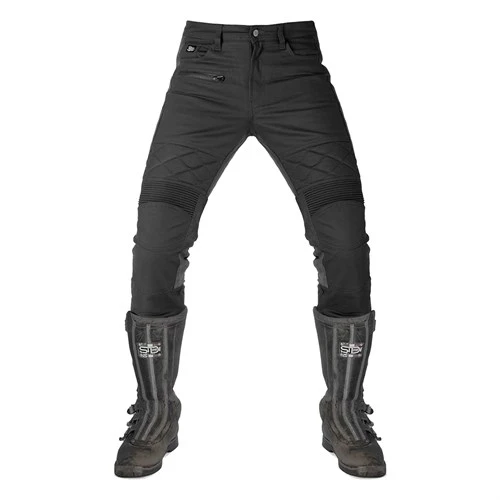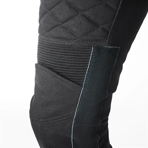 In terms of styling, you get two jean pockets in the rear, two more at the front, and a pocket for change protected by a waterproof zip! Above the knees, and in the waist at the back, there’s concertina stretch banding for comfort. You also get some small panels of quilted padding above the knees. Now on the Sergeant pants this is purely decorative, but it mimics what passed for added protection back in the day. Down the outside of the leg there’s a panel of suede for abrasion resistance. You get the same down the inside of the legs, both for added purchase on the tank and to protect the rider from the heat of the exhaust.