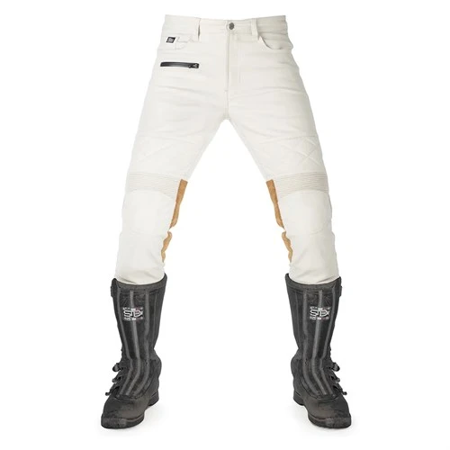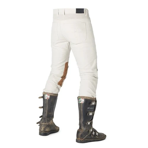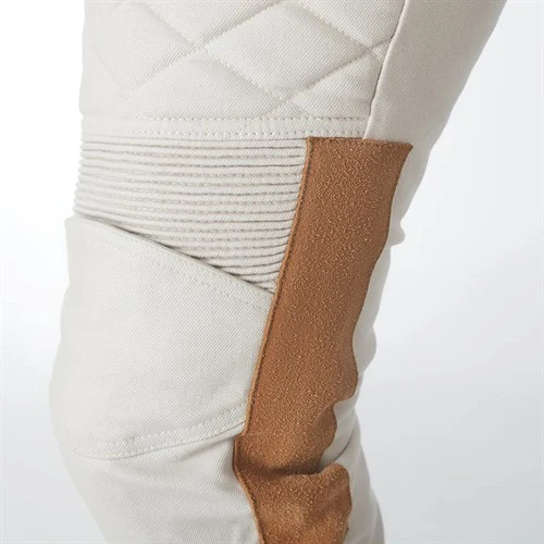 In terms of styling, you get two jean pockets in the rear, two more at the front, and a pocket for change protected by a waterproof zip! Above the knees, and in the waist at the back, there’s concertina stretch banding for comfort. You also get some small panels of quilted padding above the knees. Now on the Sergeant pants this is purely decorative, but it mimics what passed for added protection back in the day. Down the outside of the leg there’s a panel of suede for abrasion resistance. You get the same down the inside of the legs, both for added purchase on the tank and to protect the rider from the heat of the exhaust.