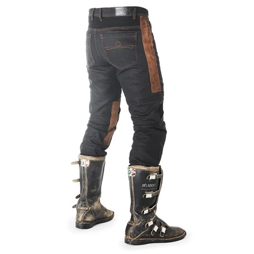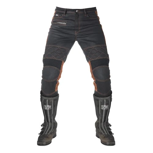 In terms of styling, you get two jean pockets in the rear, two more at the front, and a pocket for change protected by a waterproof zip! Above the knees, and in the waist at the back, there’s concertina stretch banding for comfort. You also get some small panels of quilted padding above the knees. Now on the Sergeant pants this is purely decorative, but it mimics what passed for added protection back in the day. Down the outside of the leg there’s a panel of suede for abrasion resistance. You get the same down the inside of the legs, both for added purchase on the tank and to protect the rider from the heat of the exhaust.