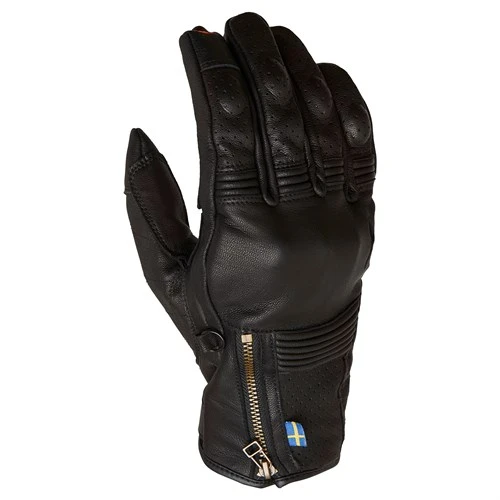 The Hofors is an out-and-out summer glove. It’s made from a super-soft, perforated goatskin. For added protection, there’s a pad of abrasion-resistant Hi-Art in the palm. Whilst, on the knuckles, you get a hard-formed, knuckle protector. The fingers are touchscreen sensitive, so that you can use the phone or satnav whilst you’re on the bike. The lining is also laminated to the ends of the fingertips to prevent the lining being pulled out of the gloves. The glove fastens by means of a side zip. It comes in black and in brown.