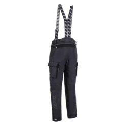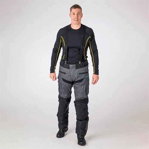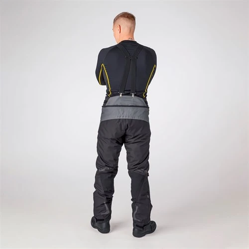 For comfort, there are stretch panels in the crotch and in the back of the legs. You also get concertina banding at the knees. The pants come with braces, which are useful off the bike, although on it you would probably zip into the jacket with the full length zip. The waist features elasticated adjusters. In the lower part of the leg, long zips will allow you to wear the Myrtorp over almost any boot. You also get a Velcro closures at the bottom of the leg.
