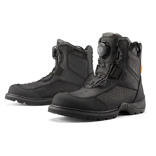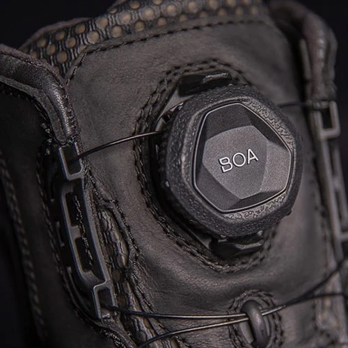 The upper of the Icon Stormhawk boot is fashioned from a waterproof treated leather. The waterproof membrane itself comes from eVent. It’s a membrane that is highly regarded in the outdoor and mountaineering world. There are reinforcements in the toe and heel for extra protection. The ankles have D3O pads in them. There are nibs for the gear change, and you get a rubber overlay at the end of the toe. You get a small reflector on the heel. The sole is pretty rugged. There’s a padded shaft for comfort, and you get a couple of loop pulls to help you get the boot on. The USP, though, is the easy-to-use BOA lacing system. It’s simply brilliant. It allows the boot to open up incredibly wide, and makes getting in and out really fast.