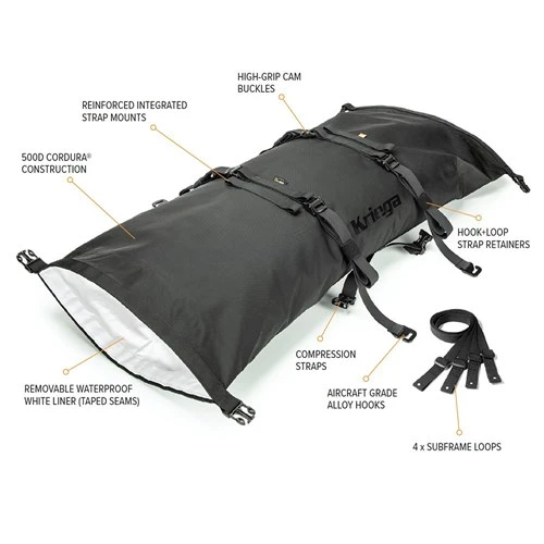 This new for 2023 range of Kriega Rollpacks comes in two size options and three colours. The Rollpacks are 100% waterproof. They are very tough being made from a 500D Cordura Lite outershell but lightweight and easy to tie on. You have a double access system so you can access gear from either end of the rollpack. The bags are designed to sit either on a rear rack or pillion seat and come with all the necessary ties to attach them to a bike.