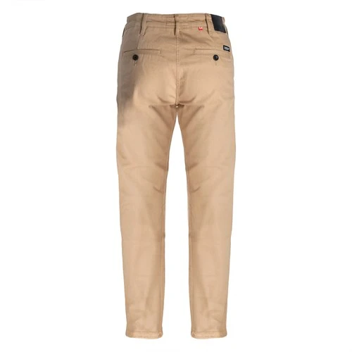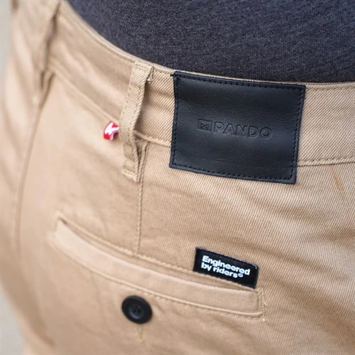 The Pando Moto Tuff chino is the culmination of a project we have been working on with Pando Moto for some months. The brief was a chino you could wear in to the office . The colour is somewhere between khaki and camel. The material feels and looks like a cavalry twill. This is not a heavy pant but neither it is a summer holiday lightweight pant. After all it is still a protective motorcycle pant.