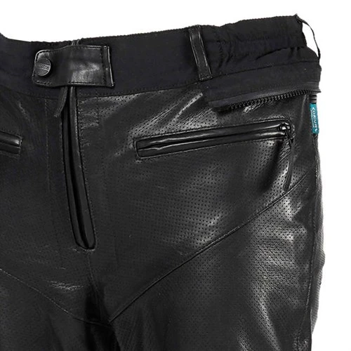 The Coriace 2 pant is made from a perforated, aniline leather. The membrane that is laminated to the inside of the leather is, unusually for Rukka, not from Gore-Tex. You get two, external, zip pockets. Concertina stretch in the knees and the back yoke. There is stretch in the waist band. You also get long zips on the legs to allow the trousers to be worn over tall, touring boots. The 60g. thermal liner can be removed. And there are fixings to take Rukka’s Defence braces.