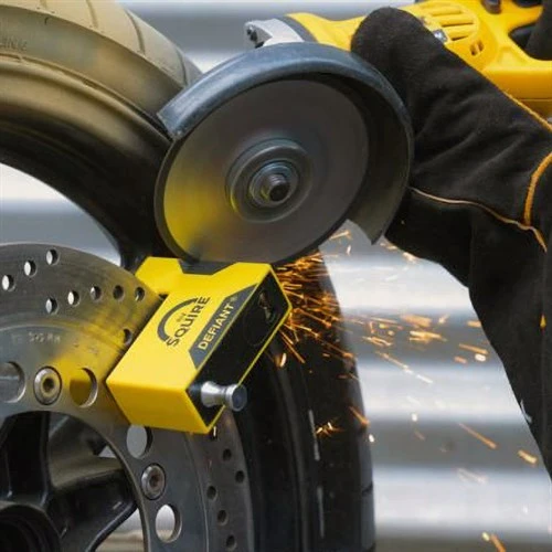 Right now, the strongest, most attack-resistant disc lock on the market is the Defiant from Squire. It’s not the smallest, it’s certainly not the lightest, and whilst we appreciate the benefits of portability, it’s still small enough to be carried about by anybody. It measures about three inches by three inches, and is an inch thick. It weighs two pounds. Put it in a pannier, a top box or a tank bag. Personally, I wouldn’t carry it about my person, or in a bum bag, because the thought of landing hard on it doesn’t bear thinking about.